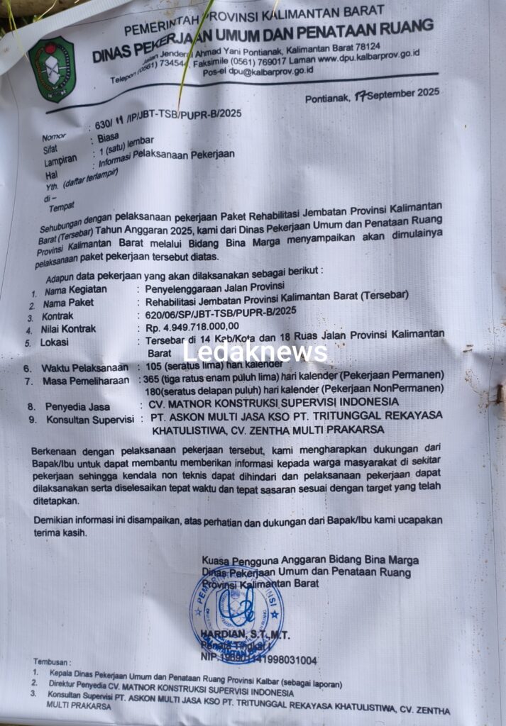 Berdasarkan papan informasi proyek di lokasi, pekerjaan tersebut merupakan Paket Rehabilitasi Jembatan Provinsi Kalimantan Barat (Tersebar) Tahun Anggaran 2025, yang dilaksanakan oleh Dinas Pekerjaan Umum dan Penataan Ruang (DPUPR) Provinsi Kalimantan Barat melalui Bidang Bina Marga. Proyek ini bernilai Rp4.949.718.000, mencakup 14 kabupaten/kota dan 18 ruas jalan provinsi.