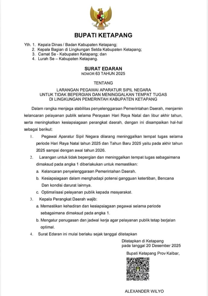 Ketapang, Kalbar– Ledaknews.com. Bupati Ketapang menerbitkan Surat Edaran Nomor 63 Tahun 2025 tentang larangan bagi Pegawai Aparatur Sipil Negara (ASN) untuk bepergian dan meninggalkan tempat tugas selama periode Hari Raya Natal 2025 dan libur Tahun Baru 2026.