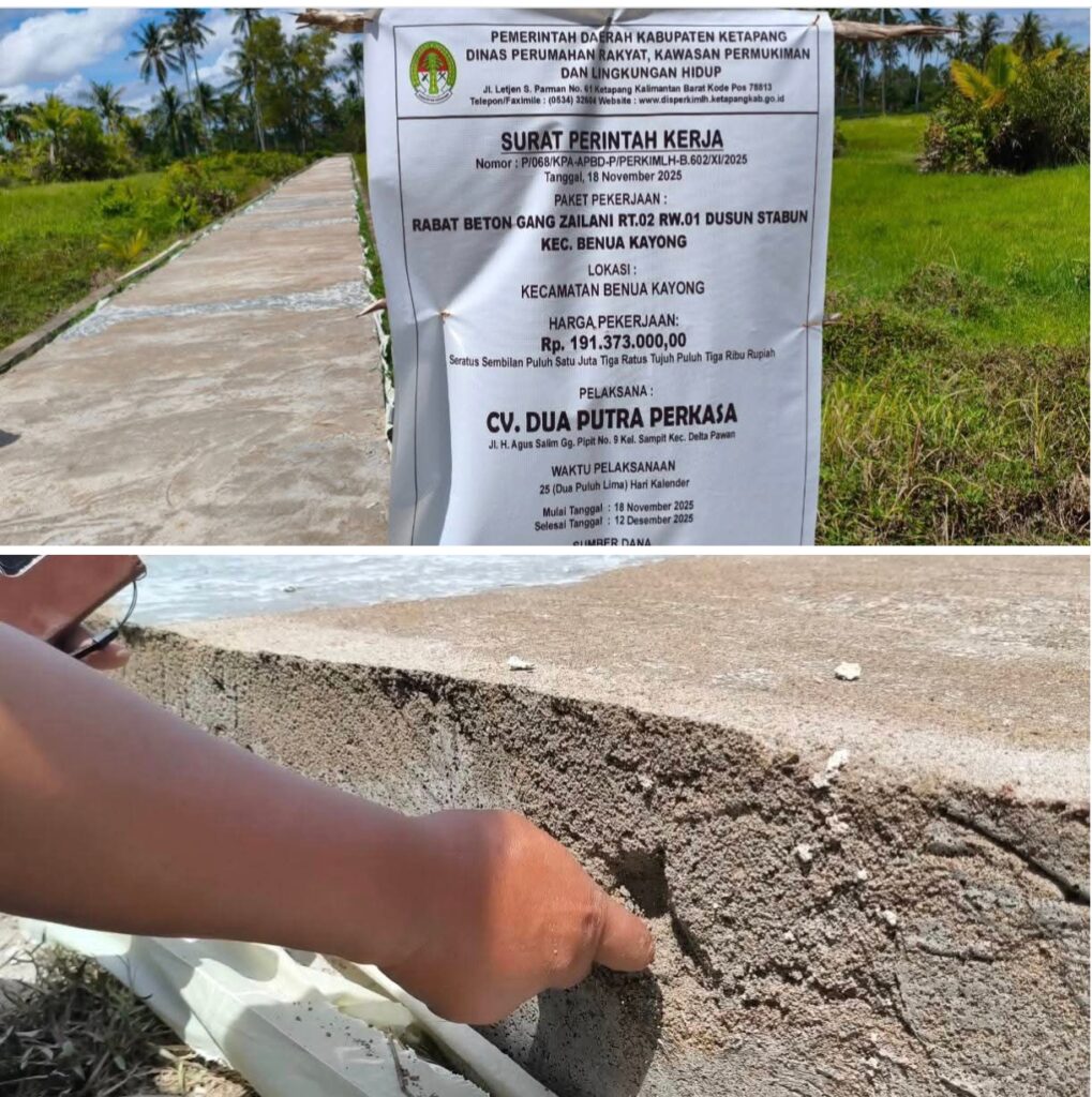 Ketapang, Kalimantan Barat – Ledaknews.com. Proyek rabat beton di Gang Zailani RT 02 RW 01 Dusun Stabun, Kecamatan Benua Kayong, Kabupaten Ketapang, diduga dikerjakan asal jadi dan berpotensi mengalami gagal mutu. Lemahnya pengawasan dari Dinas Perumahan Rakyat, Kawasan Permukiman dan Lingkungan Hidup (Perkim LH) Kabupaten Ketapang menjadi sorotan masyarakat.