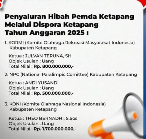 Dana hibah yang disalurkan terbagi menjadi tiga bagian: KORMI Kabupaten Ketapang mendapatkan Rp800 juta, NPC Kabupaten Ketapang Rp500 juta, dan KONI Kabupaten Ketapang Rp1,7 miliar.