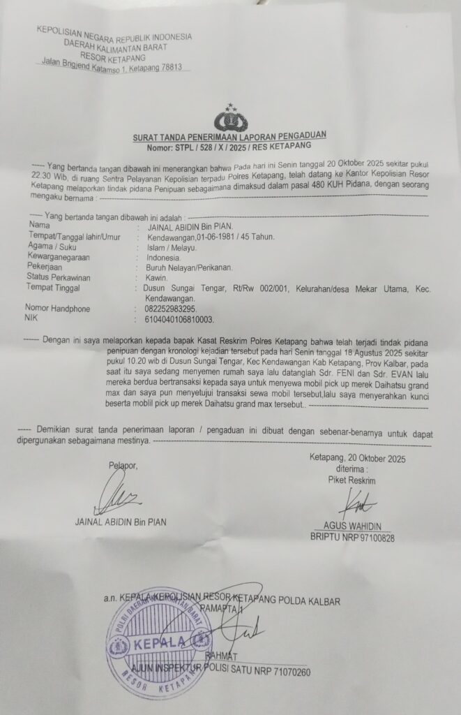 Atas kejadian tersebut korban bernama Jainal Abidin yang merasa telah dirugikan melaporkan dugaan penipuan dan penggelapan kepada Polres Ketapang pada Senin 20 Oktober 2025. dengan Nomor: STPL/528/X/2025/RES KETAPANG. yang diterima pengaduan di Sentra Pelayanan Kepolisian Terpadu Polres Ketapang oleh Briptu Agus Wahidin sebagai petugas piket Reskrim.