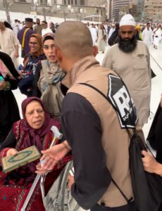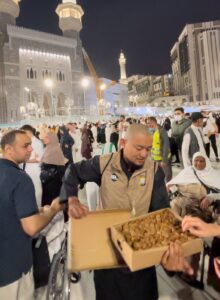 Selain membagikan makanan dan minuman, Bripka Zulhamsyah juga mewakafkan sajadah serta Al-Qur’an, termasuk Al-Qur’an resmi cetakan Kerajaan Arab Saudi yang diserahkan ke dalam Masjidil Haram.