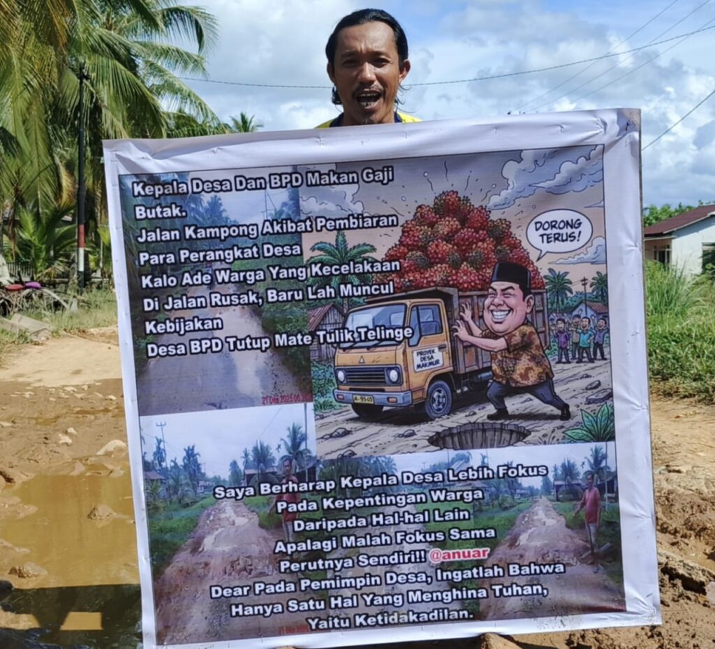 Keluhan tersebut menyatakan bahwa pihak desa dinilai “makan gaji butak” karena pembiaran terhadap jalan yang sudah tidak layak pakai, dengan kerusakan diperparah oleh mobilitas angkutan buah sawit yang menggunakan kendaraan dengan muatan melebihi kapasitas jalan.